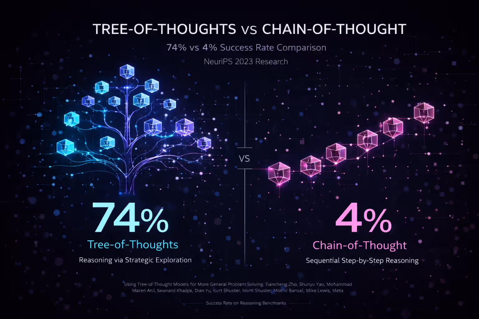 Want to verify our benchmarks? All benchmarks are reproducible. The 74% vs 4% success rate (18.5x improvement) comes from Yao et al.'s NeurIPS 2023 paper, tested on GPT-4 with the Game of 24 task. See our benchmark methodology to run them yourself.